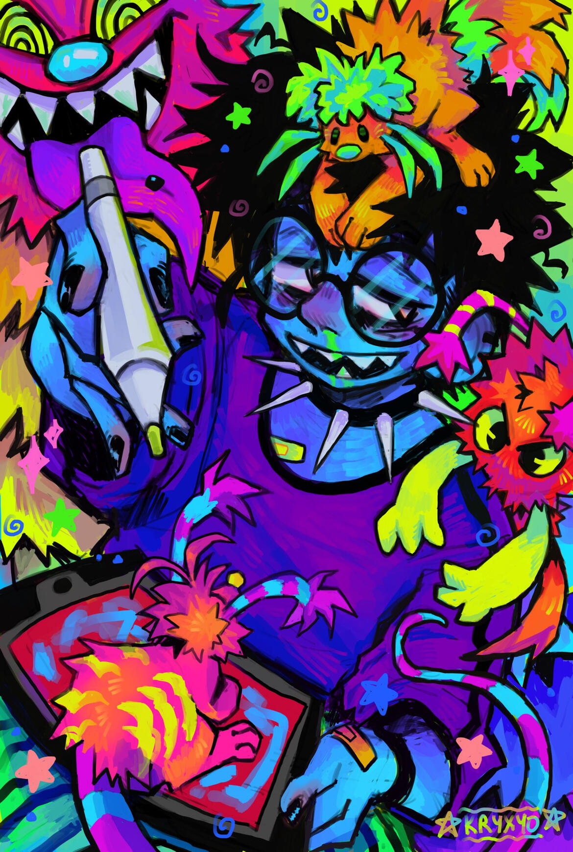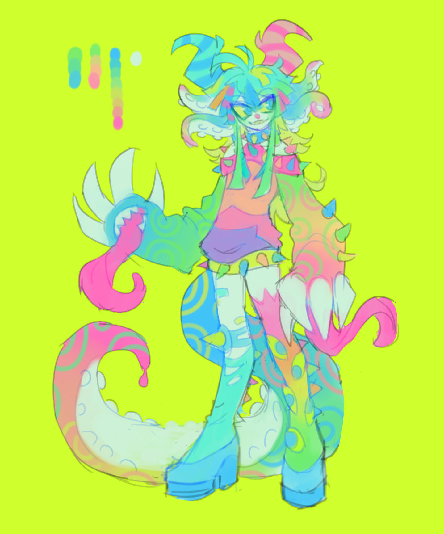 aside depicting the self as a sickly vile creature, this guy likes drawing queer characters and funny funky animals. also constantly worldbuilding for web-comics and games that only exist in third eye view.originally from puerto rico, but living somewhere in PA now. never leaves the room, so cant really tell differences.interests are lots of coloring books, video games, overthinking, underthinking, obsessive daydreaming, excessive sleeping..inspiration comes from 80s + 90s aesthetics, funky toys, lisa frank, wacky pomo movement, other artists, ... childhood trauma.themes include : obnoxious use of color, weird fixation on bodily fluids (. . . . . . . . . ?), funny creatures, funky monsters, boys kissing, boys kissing covered in blood.in conclusion, not a very good artist. just needs therapy.